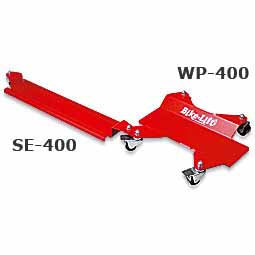 Parking platform. Side extension provides a supporting surface suitable for motorcycles with side stand. Four double castors, two with brakes.