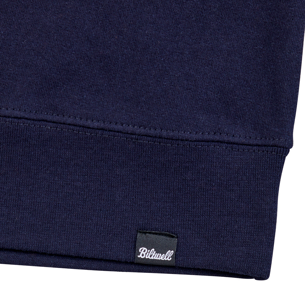 Super dark navy color is a great alternative to basic black. 8.5 oz (280 gm) cotton/polyester blend fleece is a standard fit and is detailed with hand-screened water-based inks, woven clip tag.
