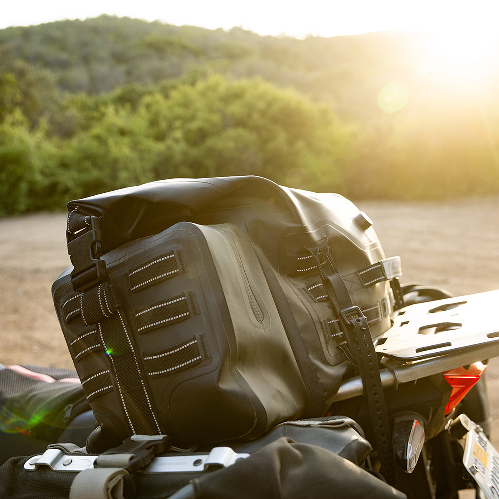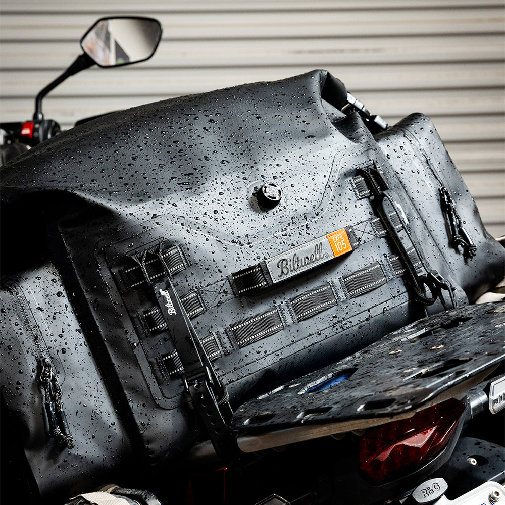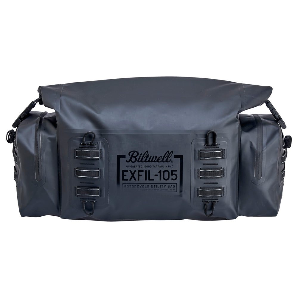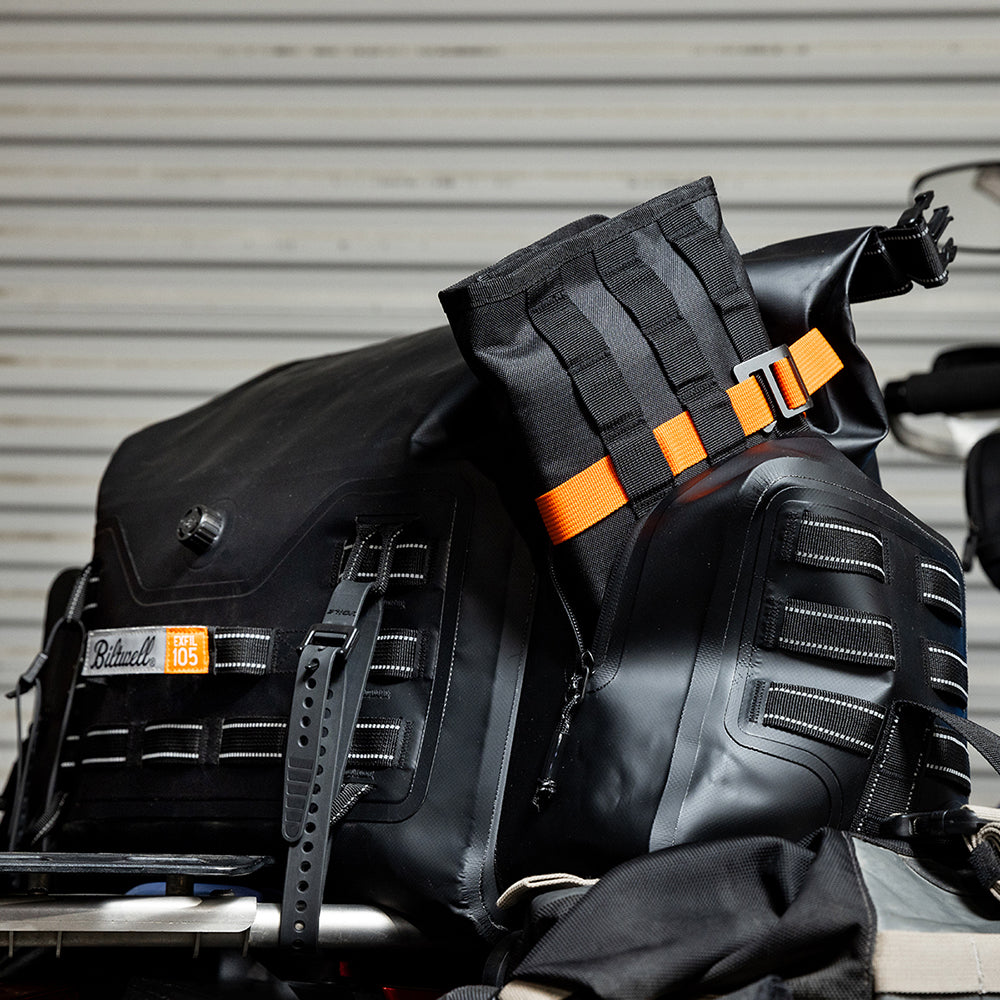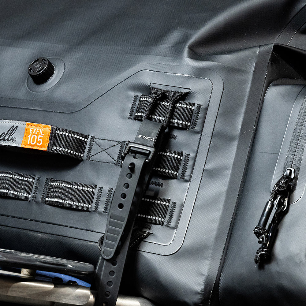 The EXFIL-105 is a massive bag meant to go across a large luggage rack or across the rear of a seat and over saddle bags. It can be attached with any straps given it’s many integrated tie-down points. The center section is thermally welded so it is 100% waterproof. The pockets on either end can be accessed without unstrapping the bag from the bike and offer tons of extra, more readily-available storage.