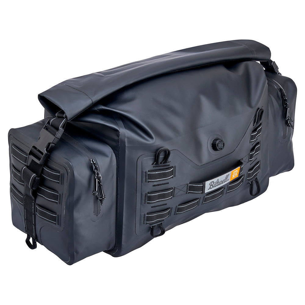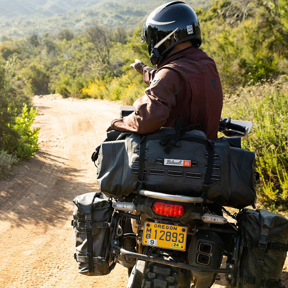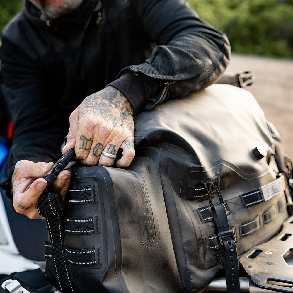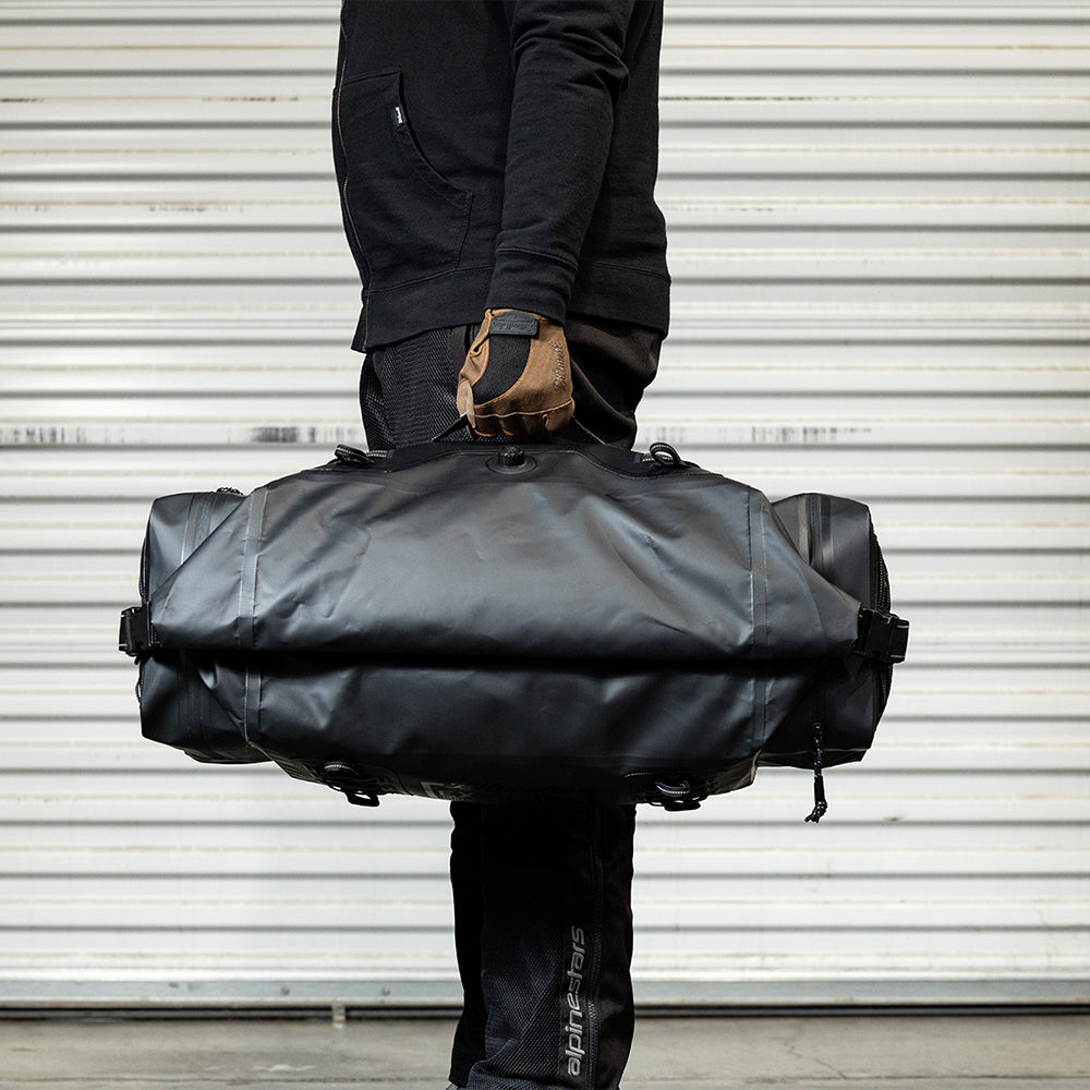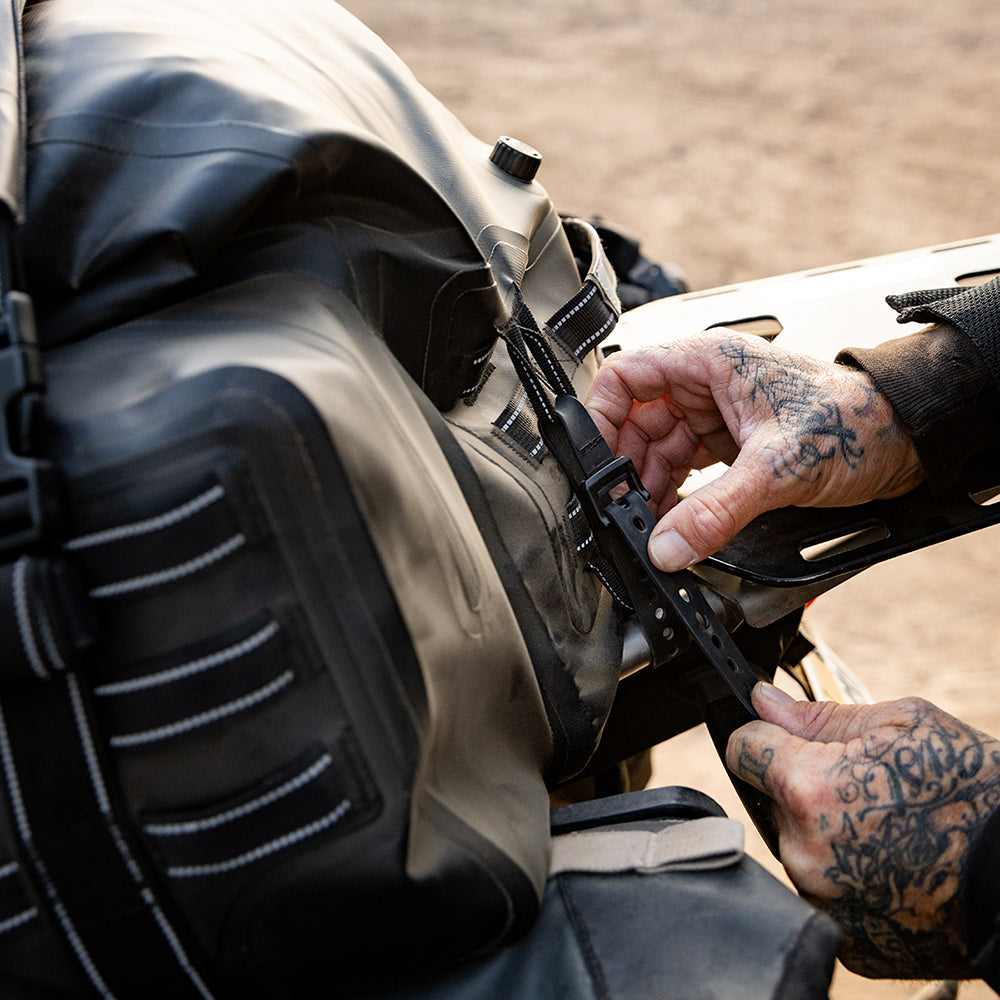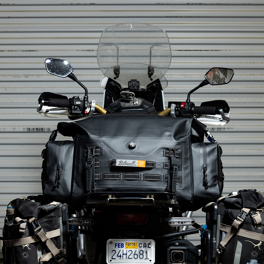 The EXFIL-105 is a massive bag meant to go across a large luggage rack or across the rear of a seat and over saddle bags. It can be attached with any straps given it’s many integrated tie-down points. The center section is thermally welded so it is 100% waterproof. The pockets on either end can be accessed without unstrapping the bag from the bike and offer tons of extra, more readily-available storage.