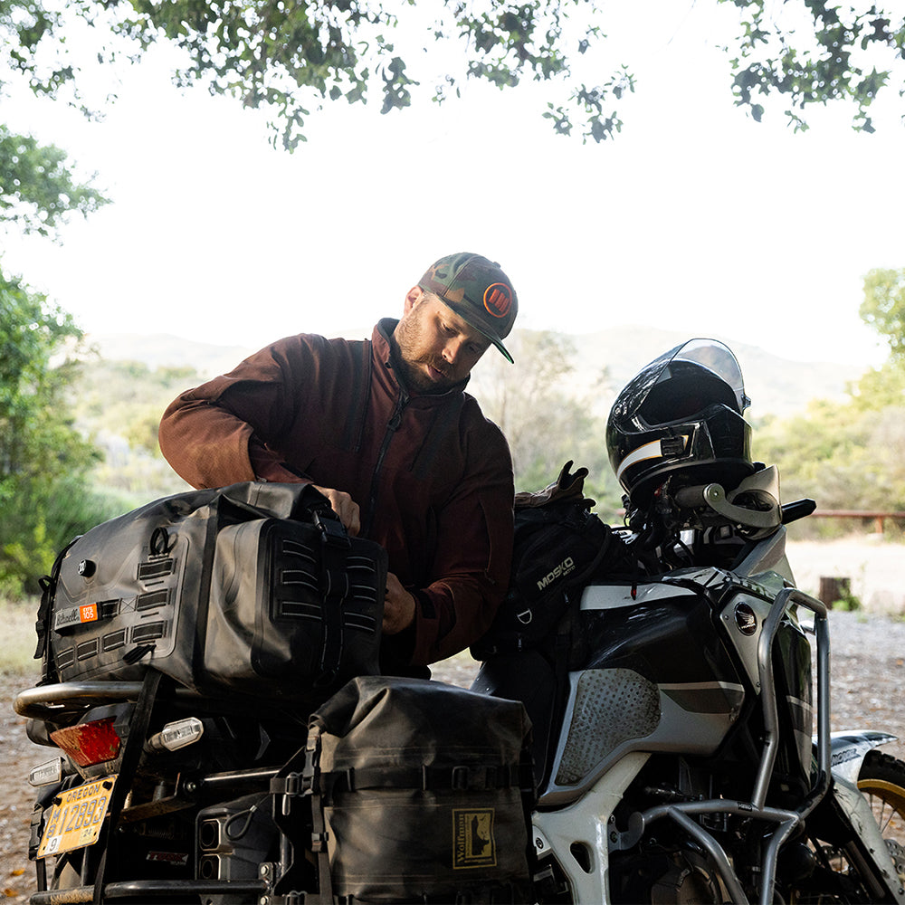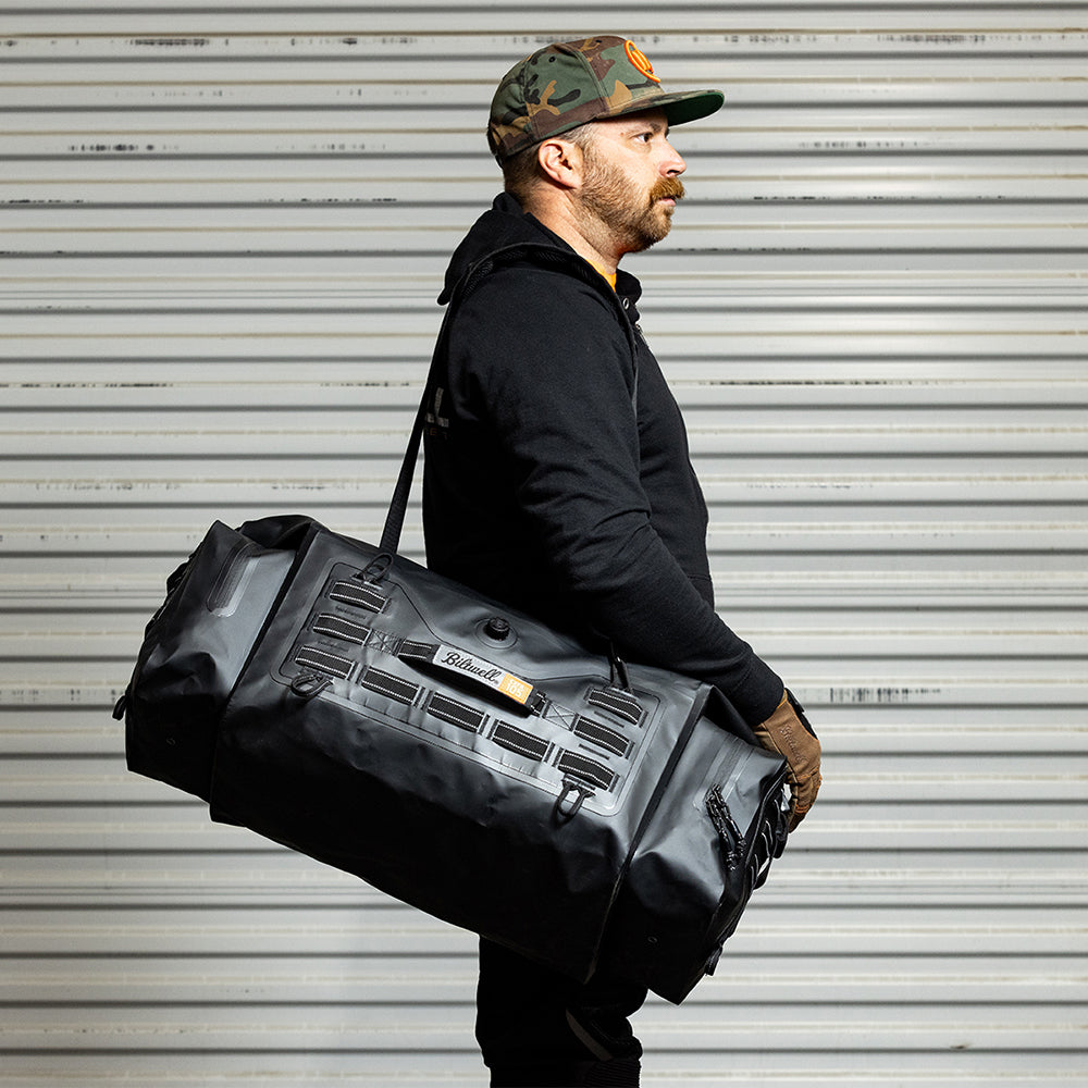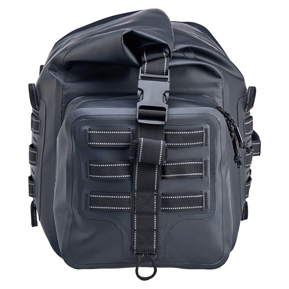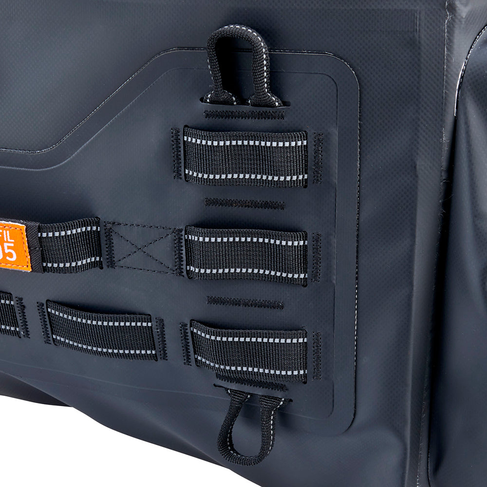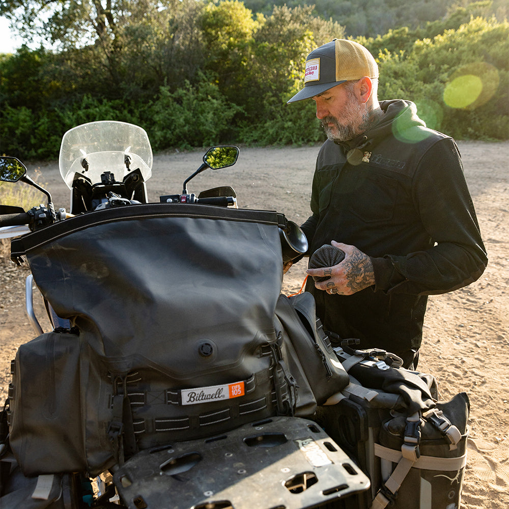 The EXFIL-105 is a massive bag meant to go across a large luggage rack or across the rear of a seat and over saddle bags. It can be attached with any straps given it’s many integrated tie-down points. The center section is thermally welded so it is 100% waterproof. The pockets on either end can be accessed without unstrapping the bag from the bike and offer tons of extra, more readily-available storage.