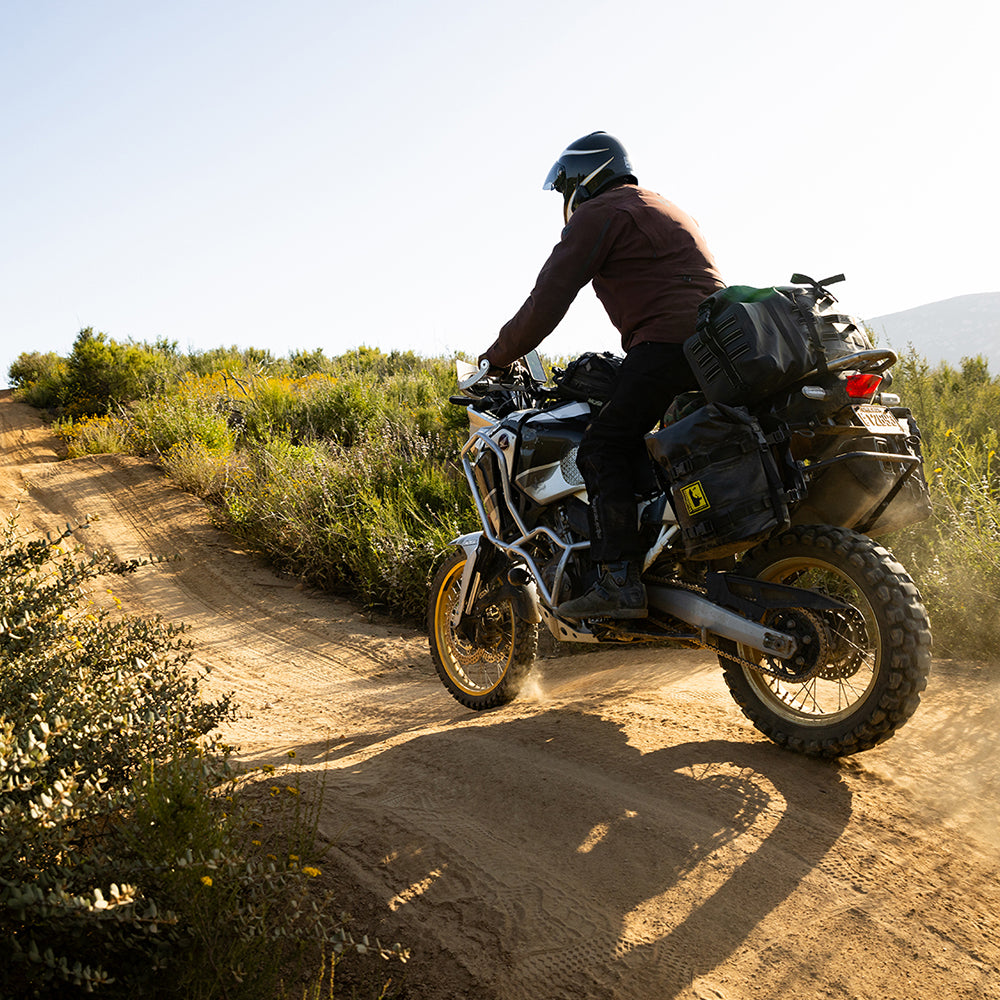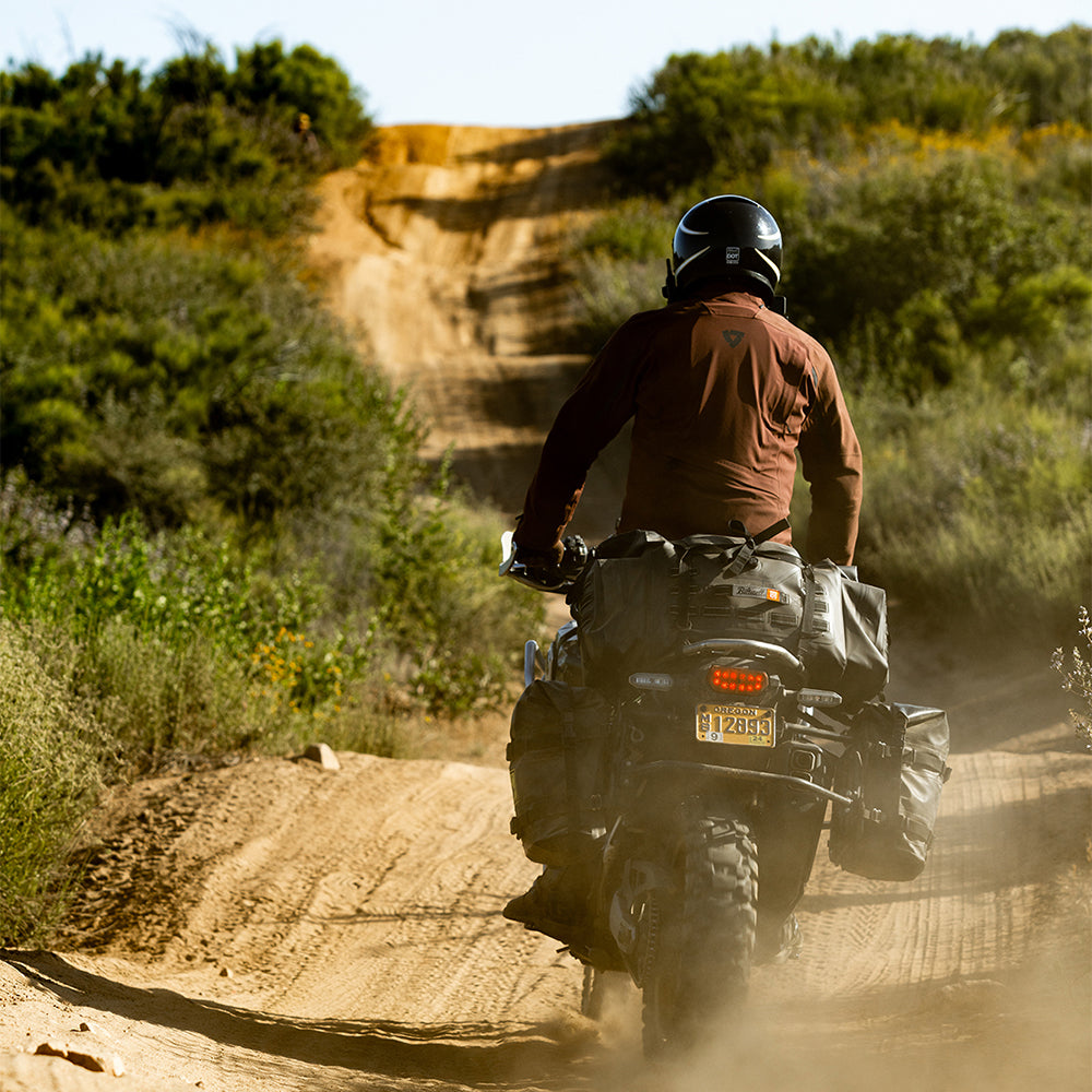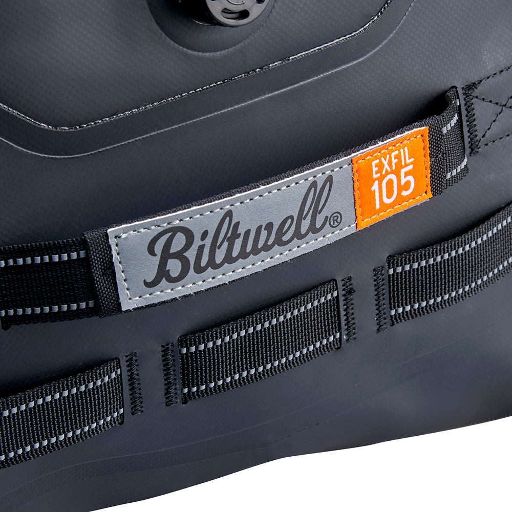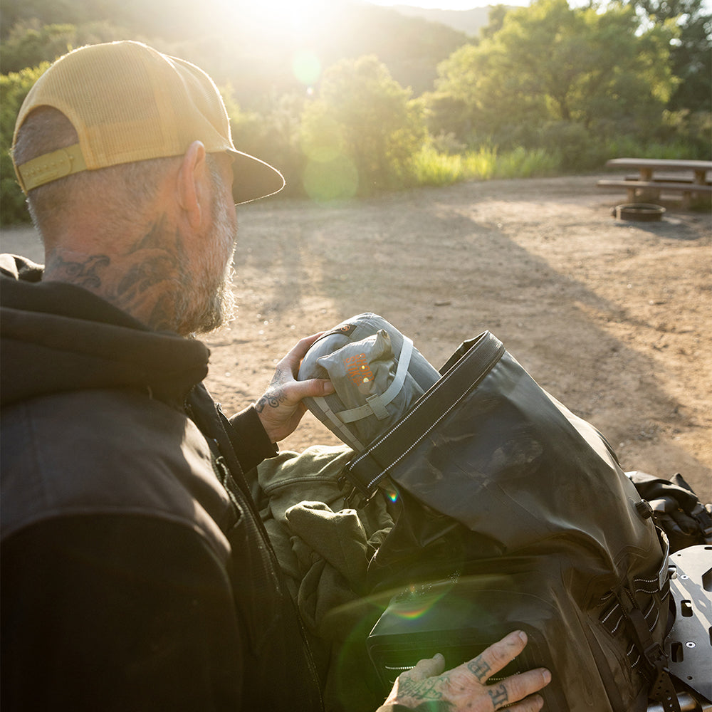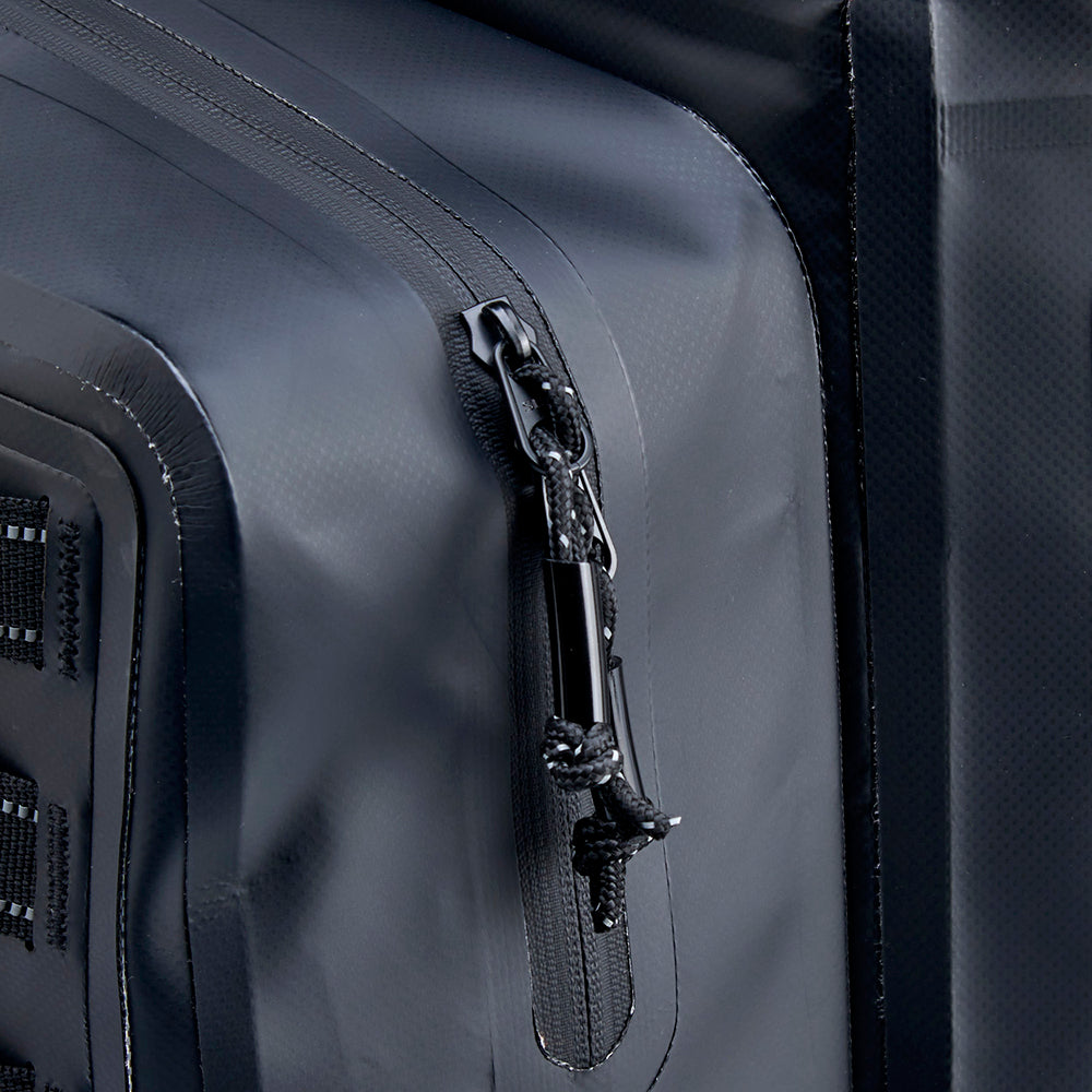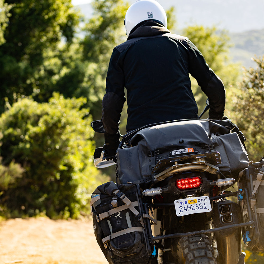 The EXFIL-105 is a massive bag meant to go across a large luggage rack or across the rear of a seat and over saddle bags. It can be attached with any straps given it’s many integrated tie-down points. The center section is thermally welded so it is 100% waterproof. The pockets on either end can be accessed without unstrapping the bag from the bike and offer tons of extra, more readily-available storage.