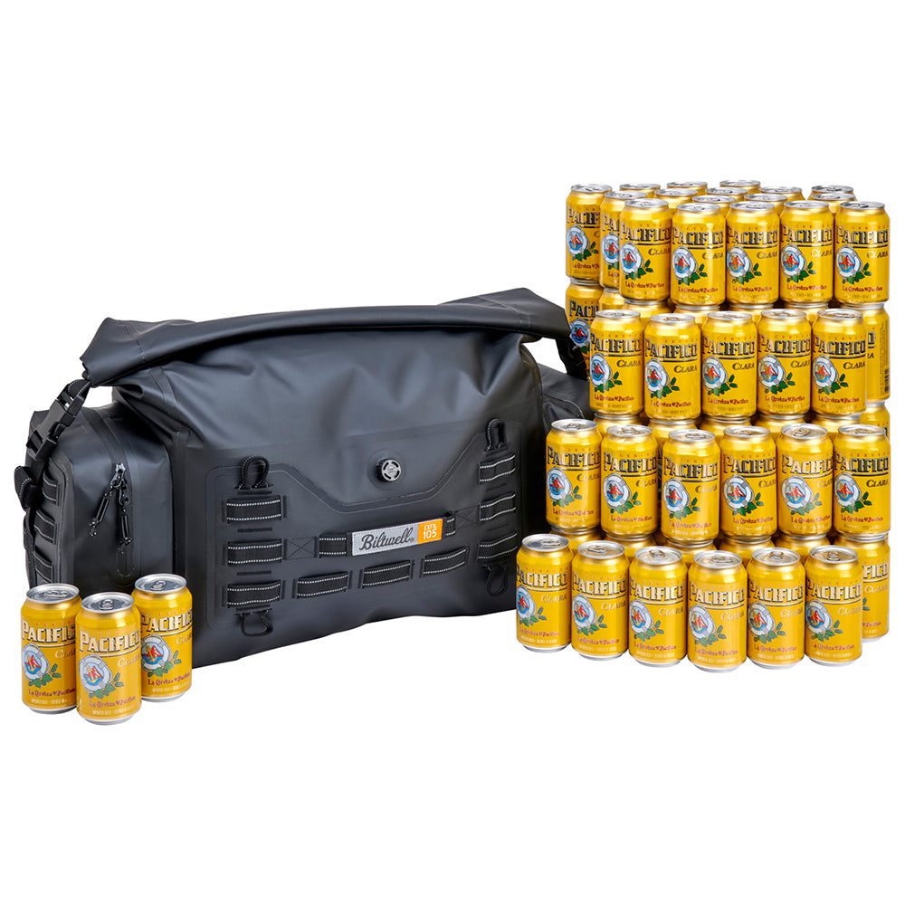 This bag is big! 26” long x 11” wide x 12” tall. We measure our interior volume in beer cans. This one, as the name implies can fit 105 frosty pops. Of course, it’s really meant to haul gear for long trips and it excels at that. The center compartment is completely water- and dust-proof. MOLLE webbing on all sides allows more gear to be attached and there are eight built-in tie-down points for true universal fit using your own straps. The EXFIL-105 is meant to be mounted sideways across a seat and over saddlebags or on a rear rack that is large enough to accommodate it. The FVT (Fart Valve Technology) allows the user to bleed air out of the center compartment to allow for full compression. This means you can cram more stuff inside and it’ll move around less.