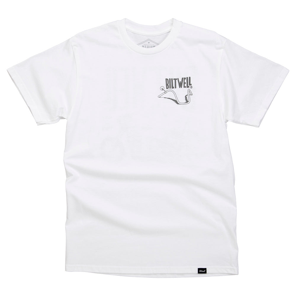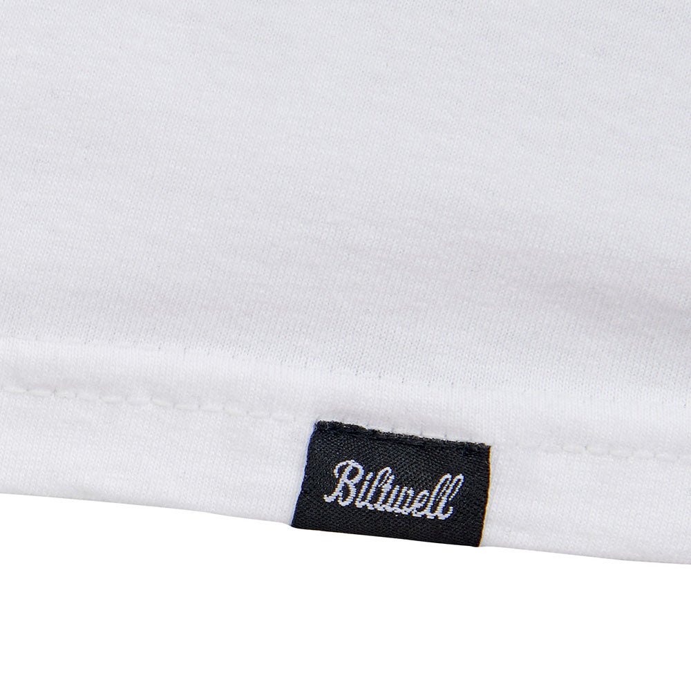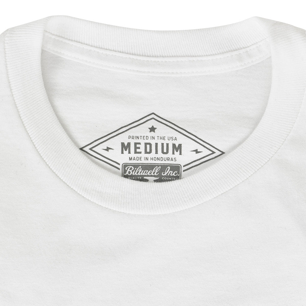 100% pre-shrunk 6oz cotton tee is detailed with hand-screened water-based inks, woven clip tags and the irritating collar tag has been replaced by a screen-printed label.