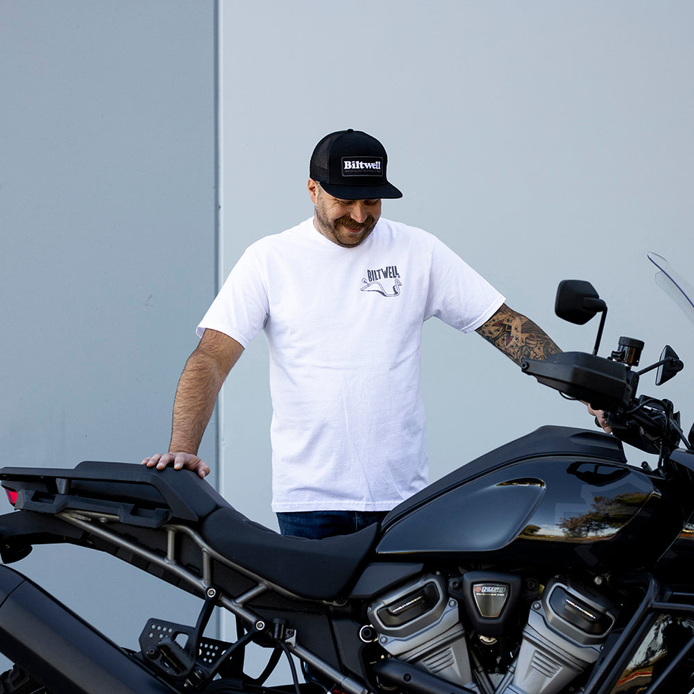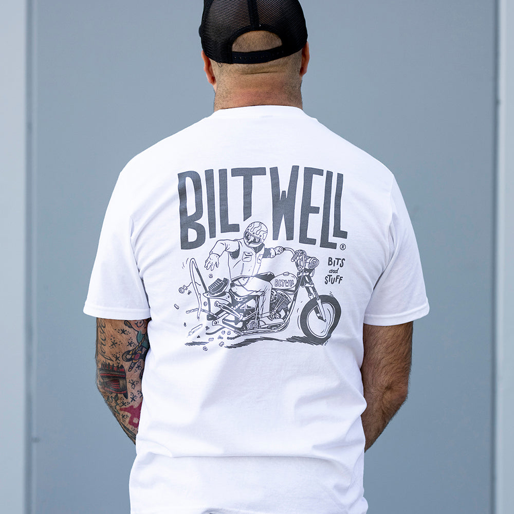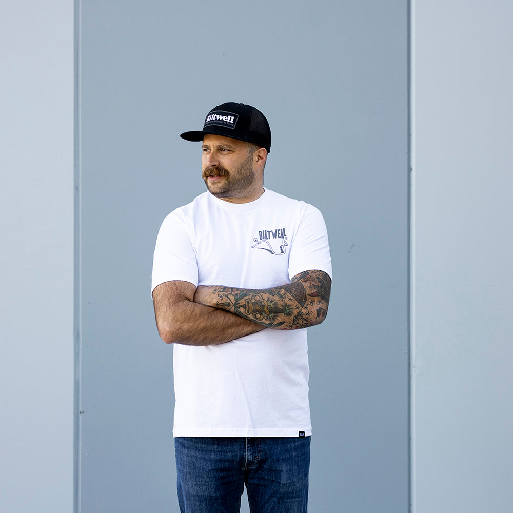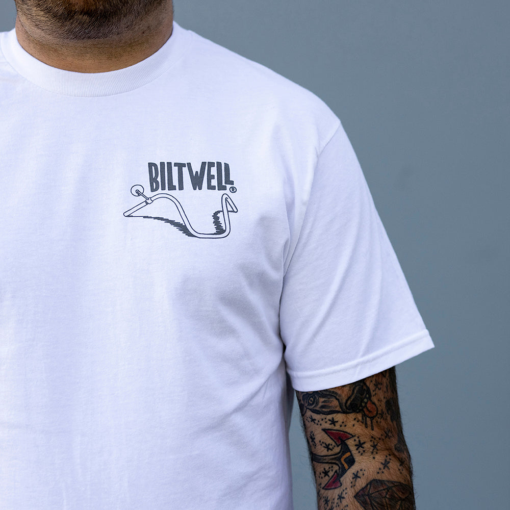 100% pre-shrunk 6oz cotton tee is detailed with hand-screened water-based inks, woven clip tags and the irritating collar tag has been replaced by a screen-printed label.