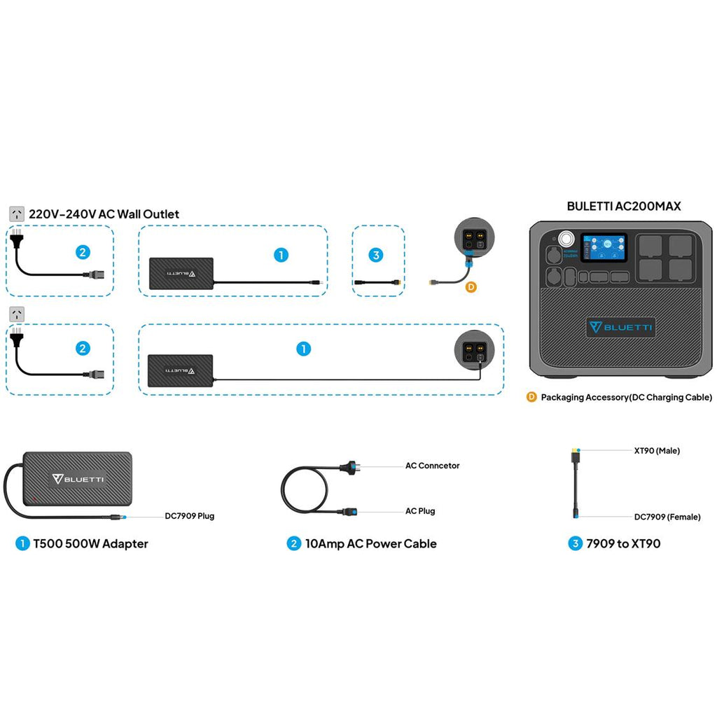 T500: Used to charge the BLUETTI AC200P/EB200P/AC200Max with dual adapters simultaneously at a Max 1,000W rate.
