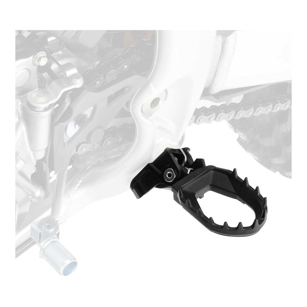 Wide footpegs minimize the accumulation of dirt and mud. A hollowed-out surface is used to ensure maximum mud removal while maintaining enough strength to resist bending easily. The balance of strength has been adjusted through repeated test rides by professional riders.