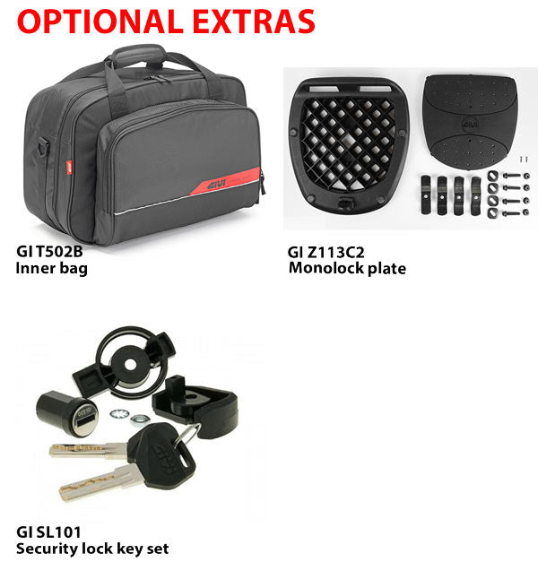 Disclaimer: Givi's Monolock top cases are designed primarily for scooters or small capacity motorcycles whose use is typically urban commuting at speeds not exceeding 60kph. Their lightweight construction is not intended for use on large capacity motorcycles at highway speeds, for these applications we recommend Givi's Monokey top and side cases.