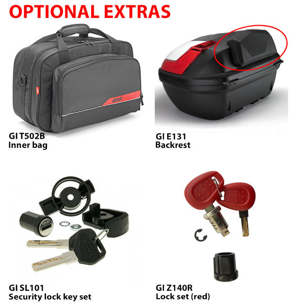 Born from years of experience, Givi has perfected one of their best-loved products, creating the new E455. This economic yet good sized top case gives you all the space that you need for your travels, allowing you to comfortably fit up to two full-face helmets. Givi's Monolock fixing system guarantees fast, simple attaching and removal of the E455 and the case comes with a universal mounting plate for fixing to your scooter's rack. The gasket used offers excellent water resistance, so you can keep your luggage dry under even the heaviest rain: tested with a special machine that simulates rain with a flow rate of 20 ltr/min.