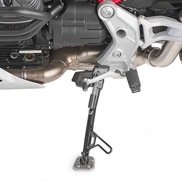 Givi have a new range of side stand supports made from aluminum and stainless steel that widen the surface support area of the original side stand. They are easy to fit and are available for the popular adventure and touring bikes.