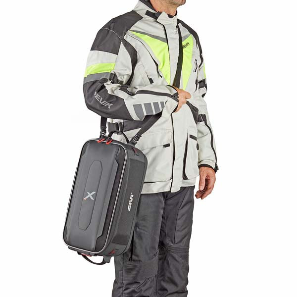 The XL10 from Givi’s X-Line range is designed to work seamlessly with aluminium top-loading panniers. Using an innovative magnetic mounting system, it attaches securely to the case lid and releases with a quick pull of the zip slider. An attachment kit and drilling template are supplied for easy installation.