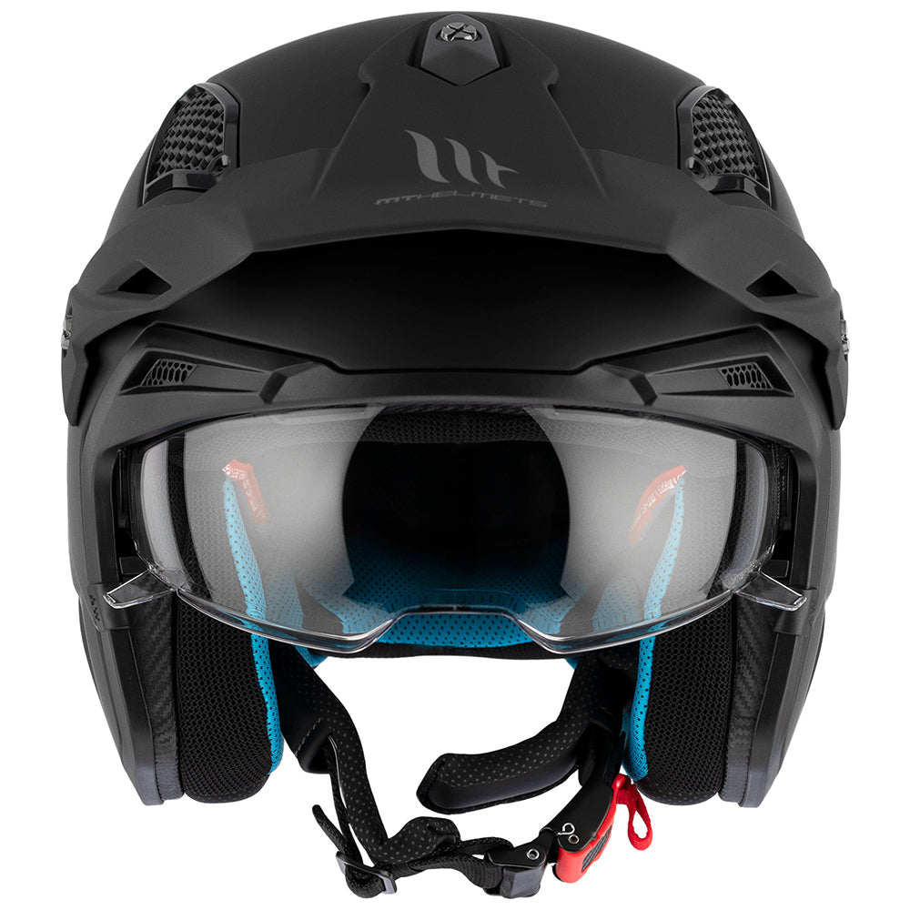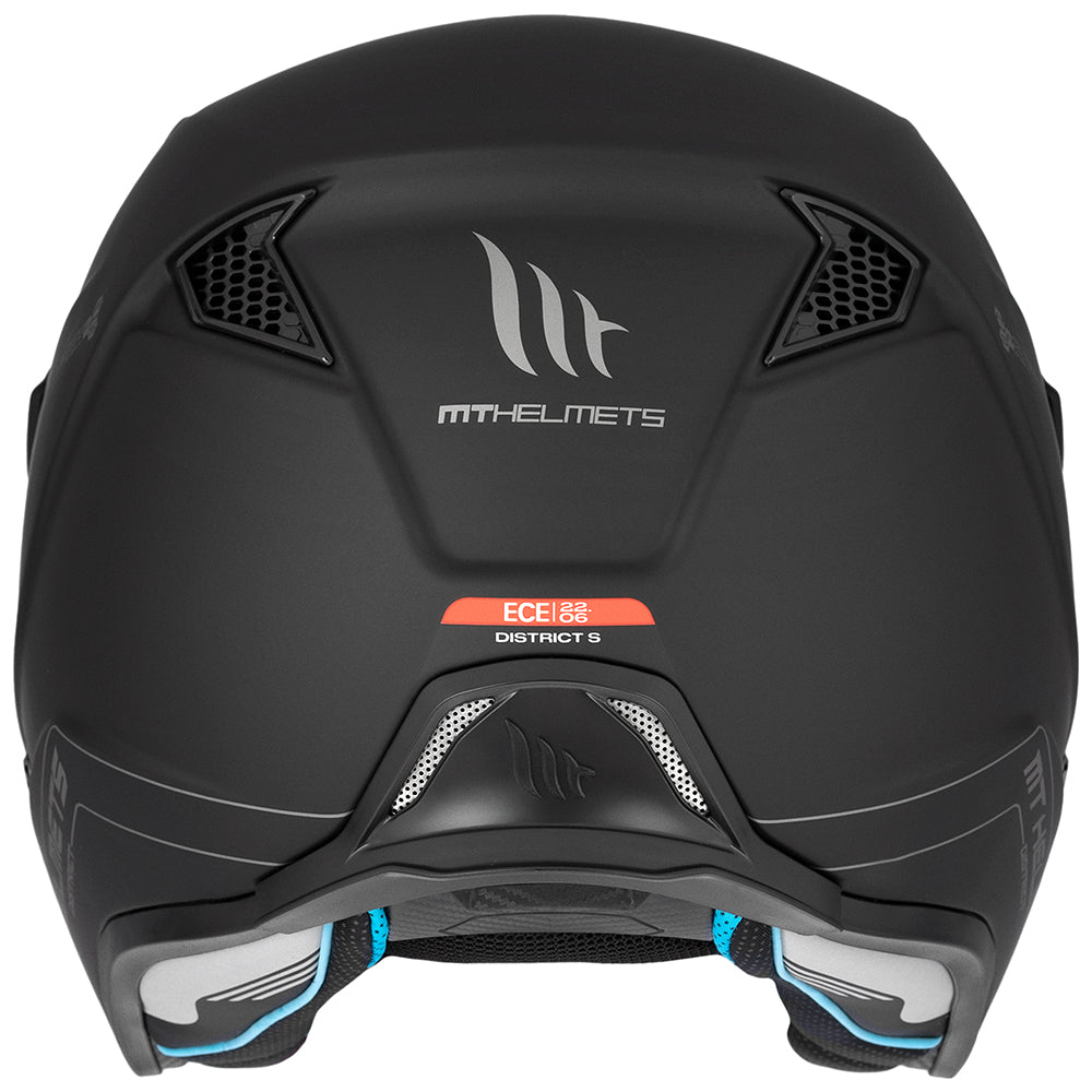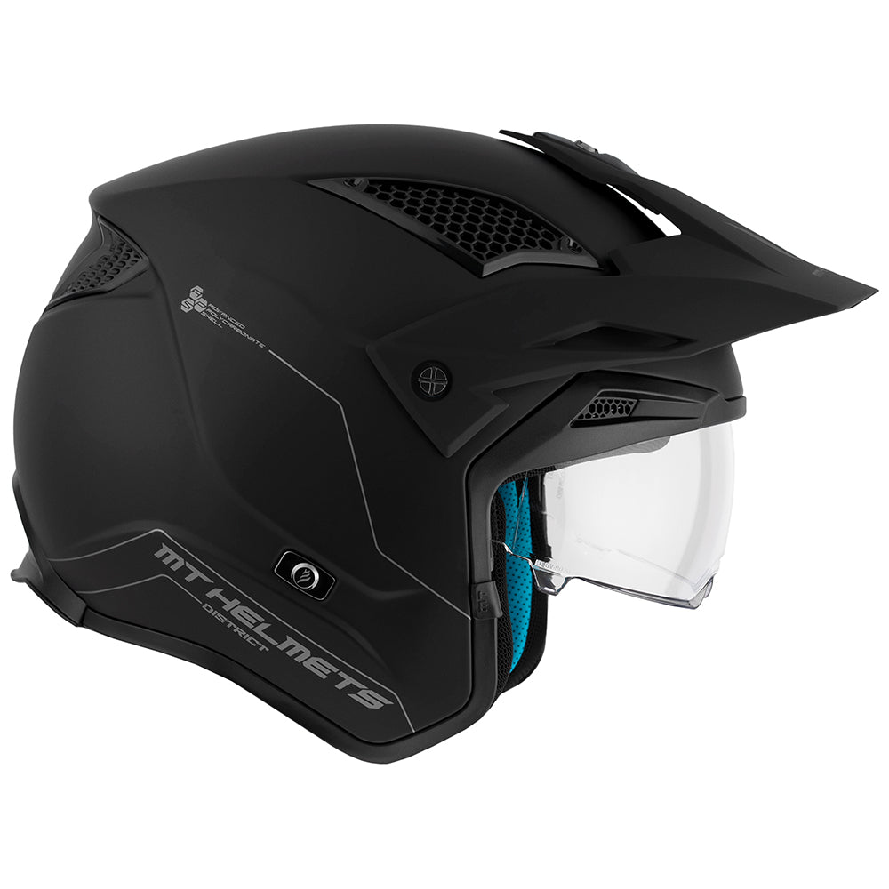 MT presents the new R22.06 trials/jet open face helmet, the District SV S. The District SV S is ideal for use in trials or on the farm thanks to its open face design and internal drop-down sun visor.