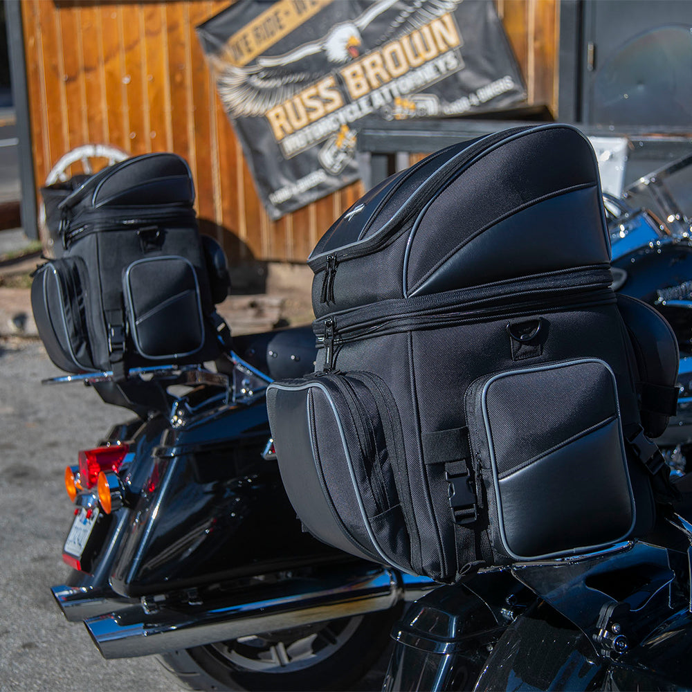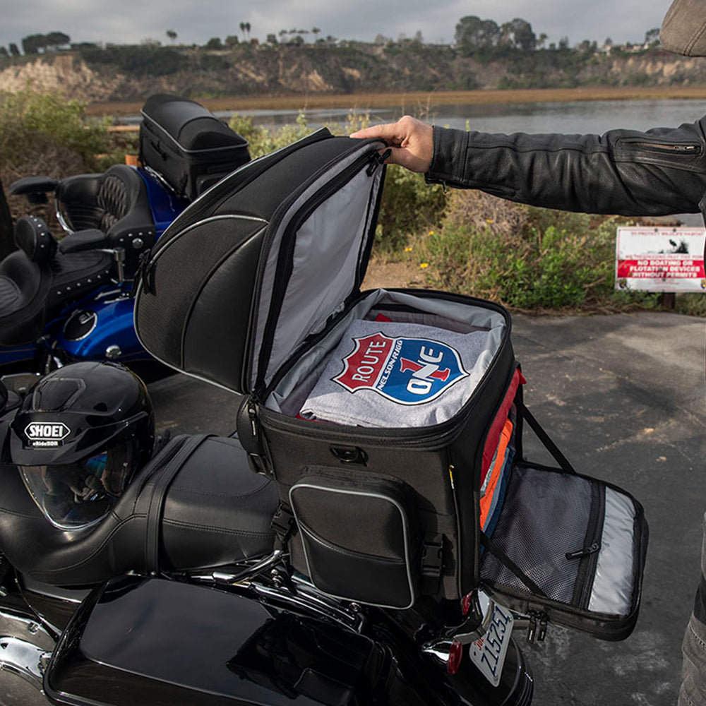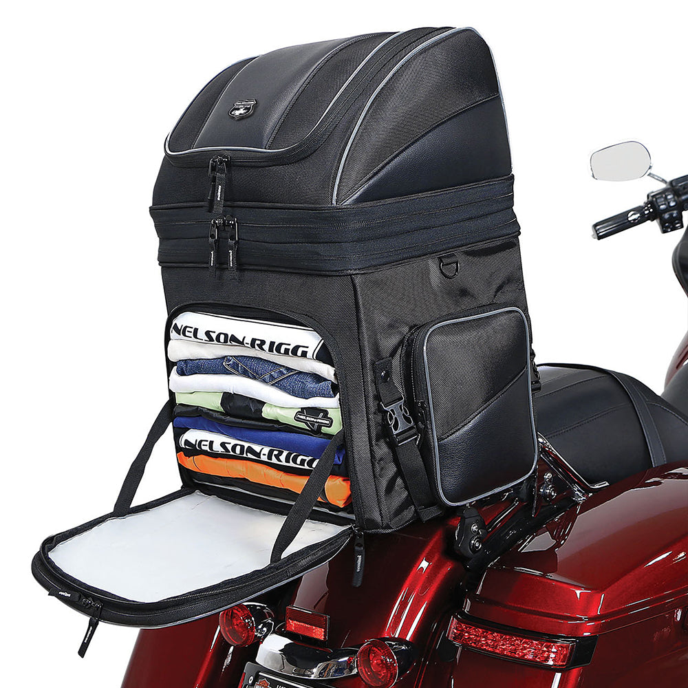 The Nelson Rigg Destination Tail / Rack Bag is made with industry-leading UltraMax fabric and comes with a lifetime warranty. It offers maximum UV protection against fading and features a strap mount system for secure attachment. The bag includes a 100% waterproof rain cover and has lockable zippers for added security. It mounts to a rack, sissy bar, or seat using quick-release and self-fastening straps. The rigid construction and solid base panel prevent sagging. A zippered panel in the top section converts the bag to one massive compartment, while the front pocket folds down to provide easy access to the main compartment. An additional 7.5cm expansion section and three generous outer pockets offer ample storage. The carry handle makes it easy to transport the bag off the bike, and reflective piping enhances visibility. Additionally, the bag can mount directly to a seat with the optional NR-USA (Under Seat Attachment).