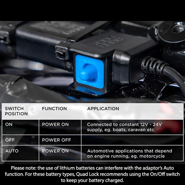 Please note: Quad Lock recommends to use on/off switch with lithium batteries to avoid battery drain