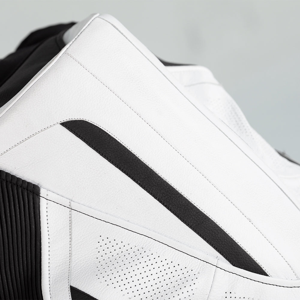 Made from super supple premium cowhide leather, the suit is reinforced with seam free, four-way woven stretch with motion panels which stretches from the side of the body to the arms and across the chest, knees, elbows, rear back, inner calf and thigh. This enhances the body length and offers superior levels of comfort and movement on and off the bike. Additionally, the double layer leather on the seat also features a stitched in coccyx protector and the inner section of the knee features Dupont™ Kevlar to aid grip on the fuel tank under heavy braking.