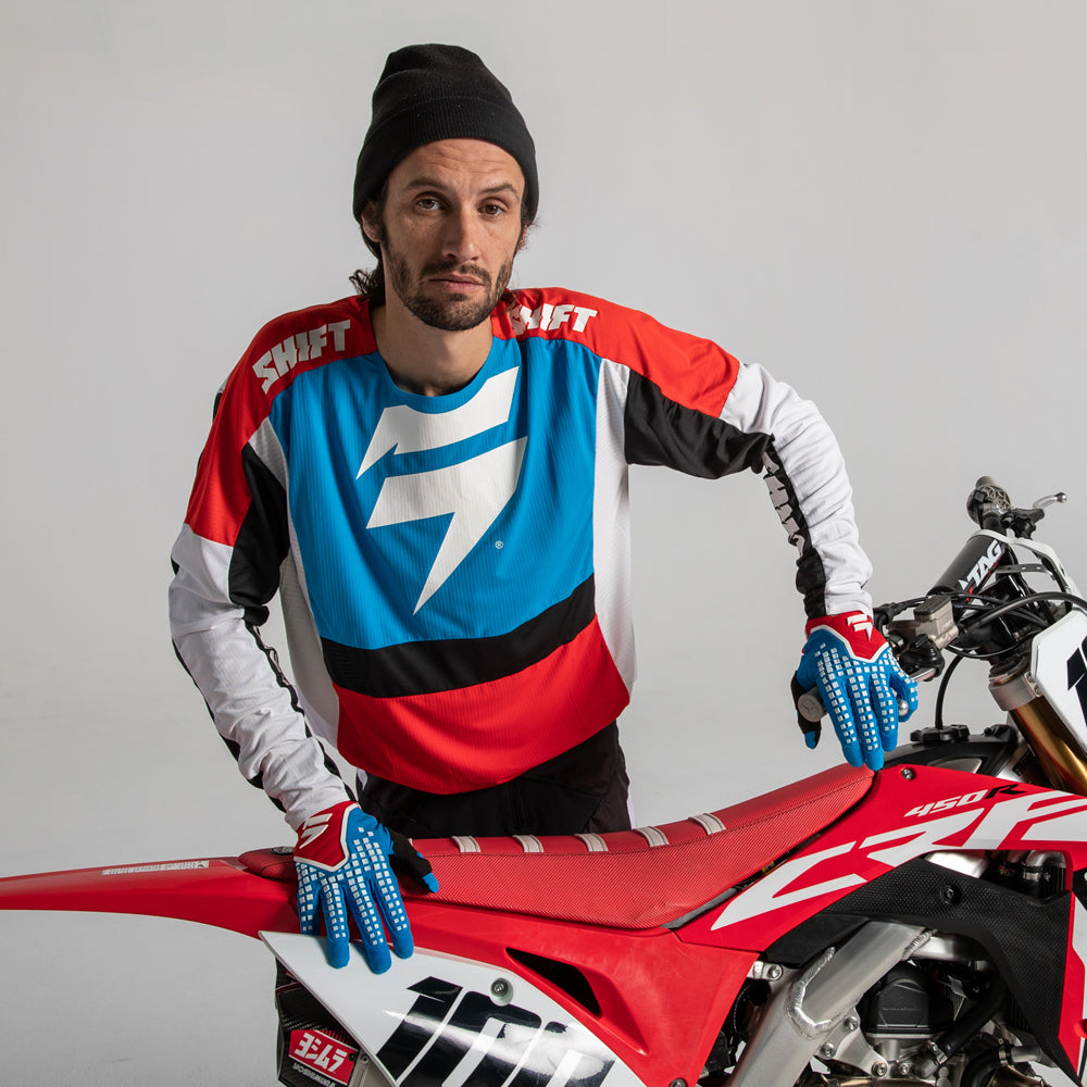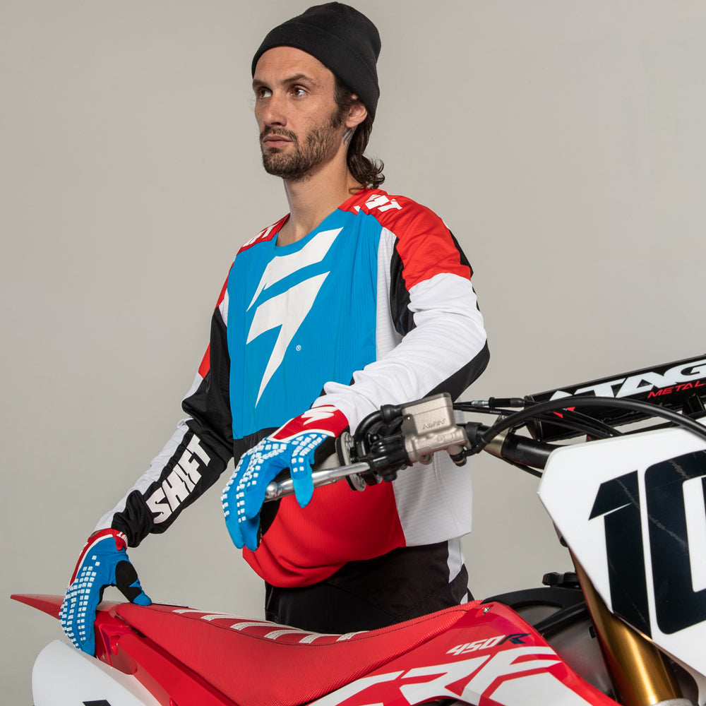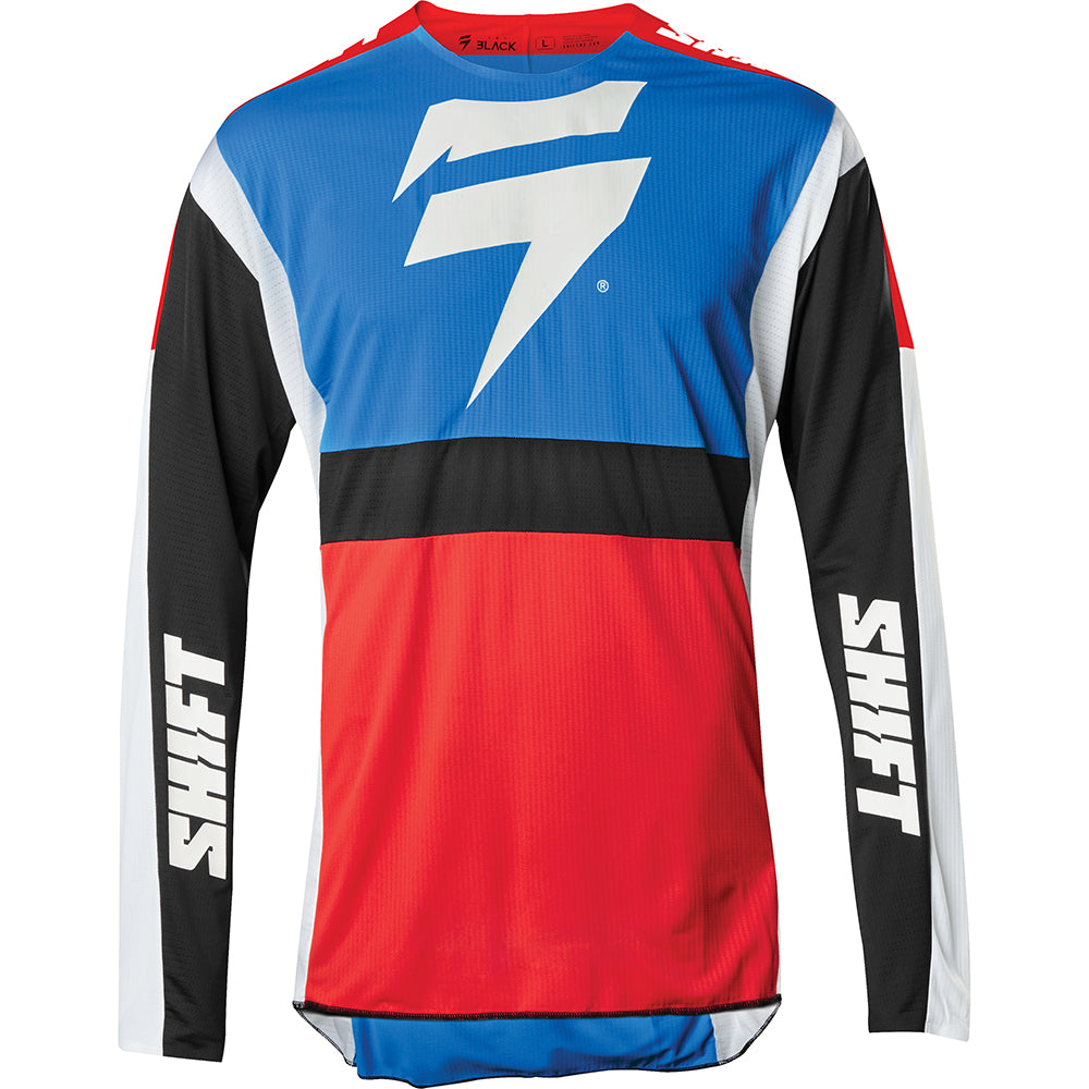 Featuring a minimalistic dual-color design, the 3LACK Label Race jersey is primed to standout on the track for its appearance while keeping you out in front with its performance. The iconic Shift bar bolt emblem is centered on the chest, while the Shift wordmark flanks each inner arm. Offered in an aqua green and white combo along with a traditional red and black colorway, a favorite of our Geico Honda team. The 3LACK Label jersey’s combination of stretch and ventilation provides you with the most free and breathable riding experience on the market.