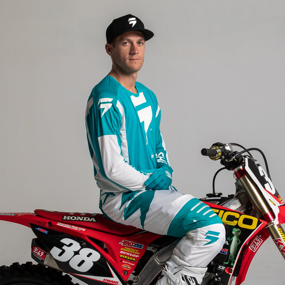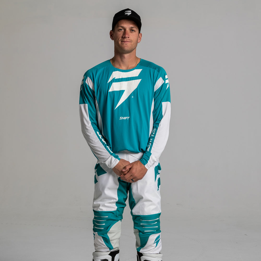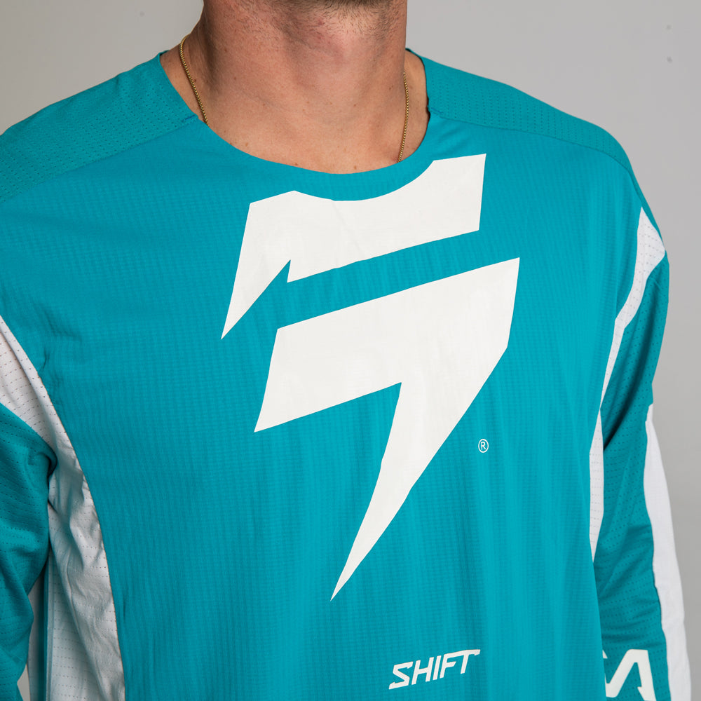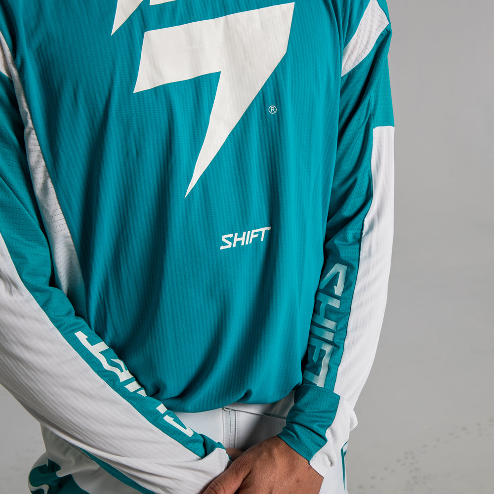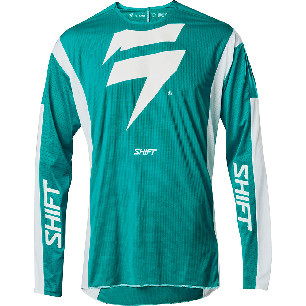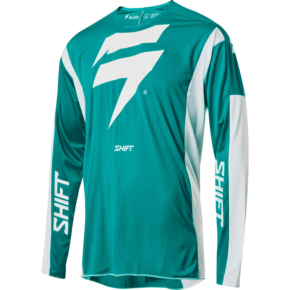 Featuring a minimalistic dual-color design, the 3LACK Label Race 1 jersey is primed to standout on the track for its appearance while keeping you out in front with its performance. The iconic Shift bar bolt emblem is centered on the chest, while the Shift wordmark flanks each inner arm. Offered in an aqua green and white combo along with a traditional red and black colorway, a favorite of our Geico Honda team. The 3LACK Label jersey’s combination of stretch and ventilation provides you with the most free and breathable riding experience on the market.