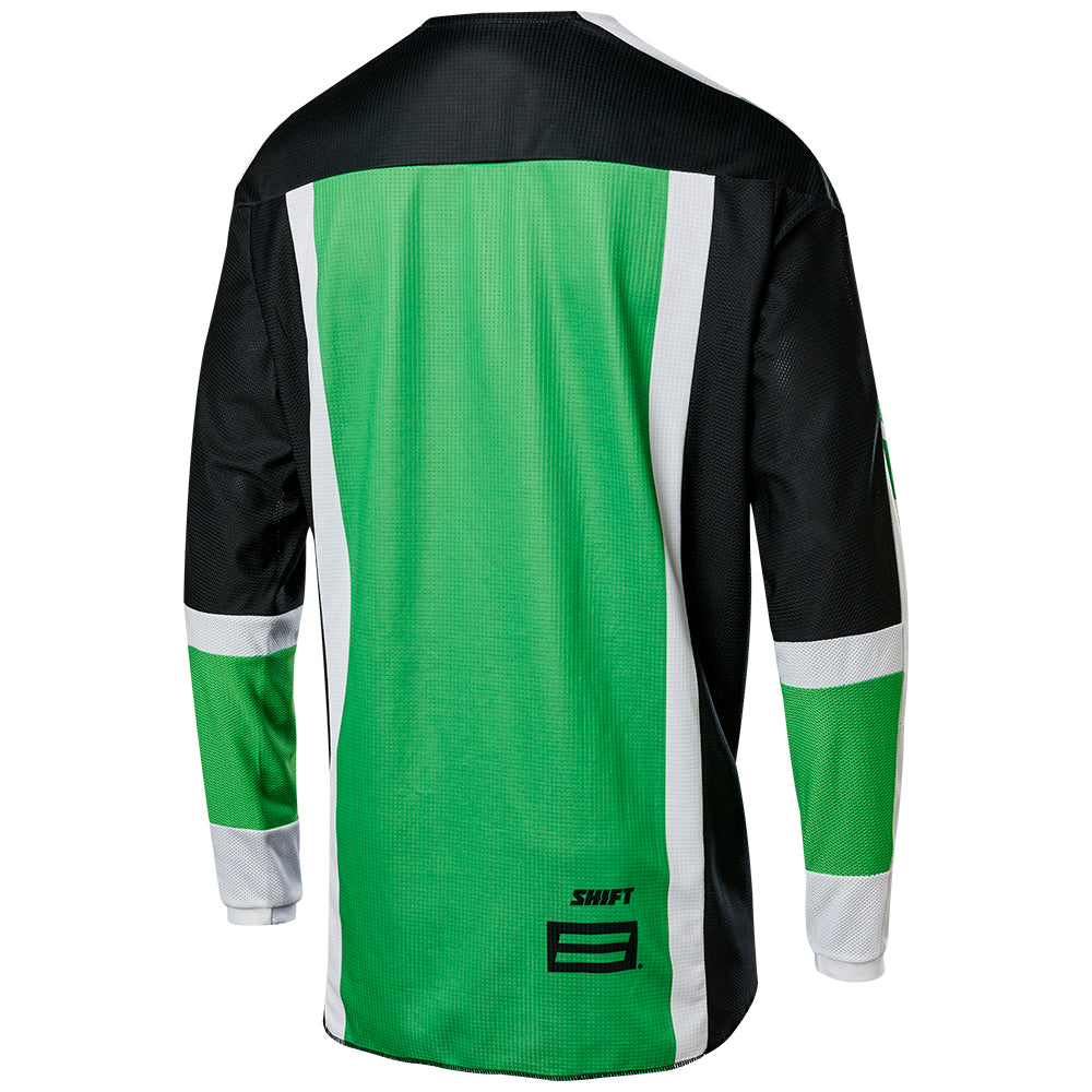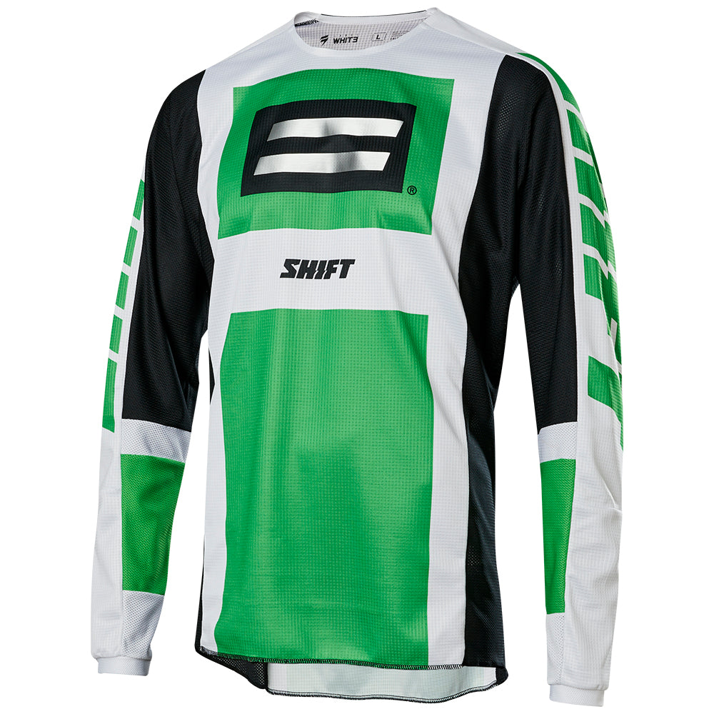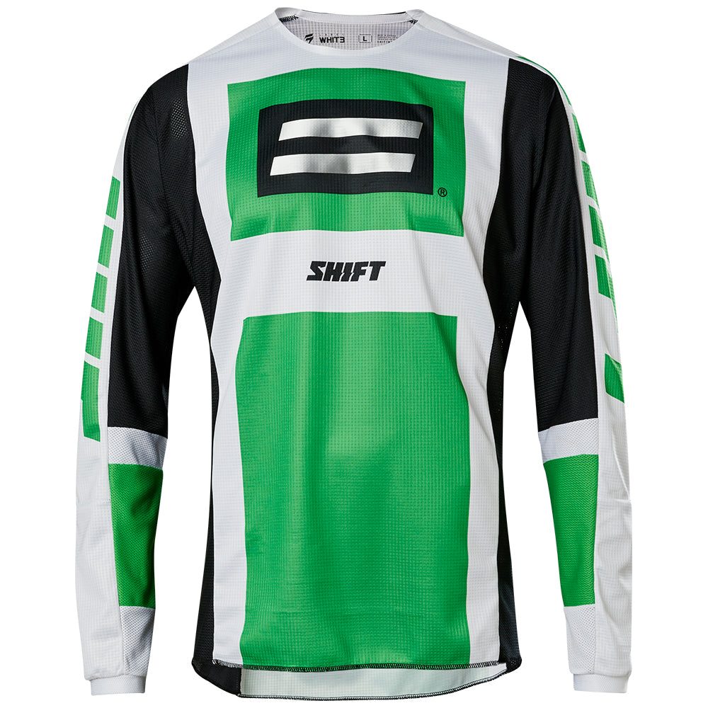 With the first drop in green and black, we pay homage to a gear set worn by Jeff Emig in 1997.The Archival WHITE Label jersey features the iconic Shift bars logo on the chest along with the old school Shift wordmark on upper sleeves for a look that has stood the test of time.